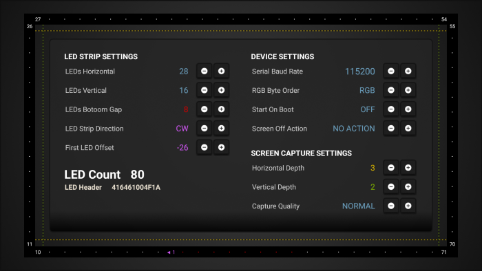 LEDs Horizontal — Эта настройка задает количество светодиодов в нашей светодиодной ленте по горизонтали, в моем случае, для экрана 42″ получилось 28 светодиодов: