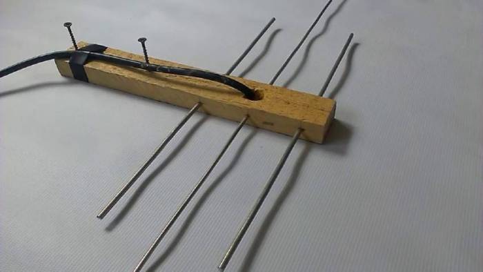 Это тоже простой способ собрать антенну своими руками. Паять нечего не придется. Достаточно запастись болтами и гайками. Правда потребуется дрель, чтобы просверлить отверстия. Усики устанавливаются в заглубления, просверленными по заранее нанесенной разметке. Крепление предполагает их фиксацию к деревянному штативу. Конструкция легкая, но прочная, надежная и долговечная.