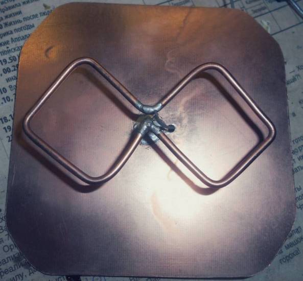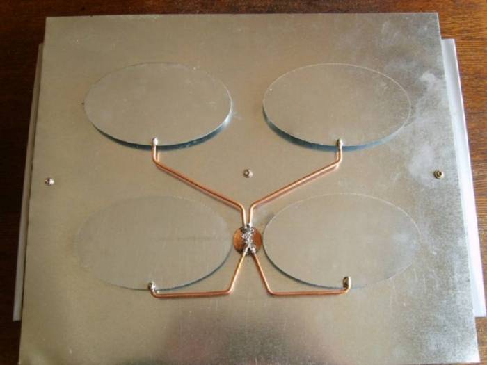 Данная модель предназначена для установки вне помещения. Это означает, что медь используют реже ввиду ее склонности к коррозии. Алюминий сечением 5-6 мм – идеальный вариант. На деревянной основе отмечают 4 точки на расстоянии 18-20 см друг от друга. Проводят ось и перпендикуляры. Вымеряют углы по 30 градусов. По этой разметке укладывают усики, которые соединяются между собой согласно схеме.