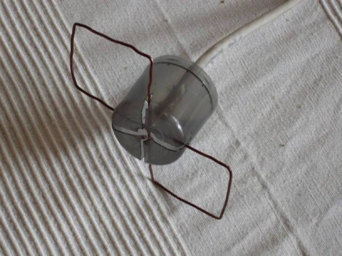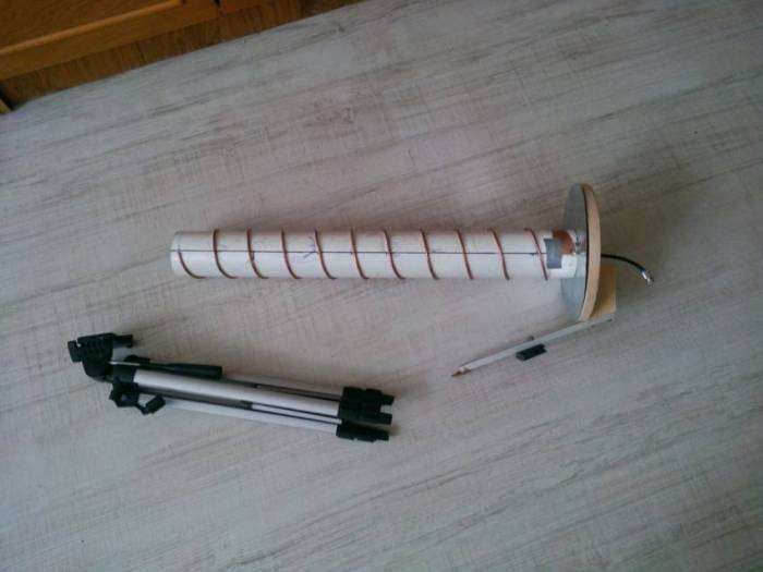 Однозначный плюс – доступность материалов, простота сборки. Процесс займет не более четверти часа. Для этого сделайте в донышках двух банок по отверстию. Снимите наружную изоляцию с конца кабеля на 20 см, не задевая оплетки. Проденьте его сквозь банки, расположенные горлышками друг к другу. На входах и выходах закрепите шнур болтами. Закрепите конструкцию скотчем к заранее приготовленному деревянному Т-образному штативу.