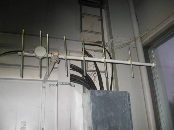 При монтаже такой антенны нужно обеспечить её ветроустойчивость, а если в качестве мачты вы используете металлическую трубу, между ней и принимающей линией требуется установить диэлектрическую вставку – деревянный брусок – длиной не менее 1,5 см.