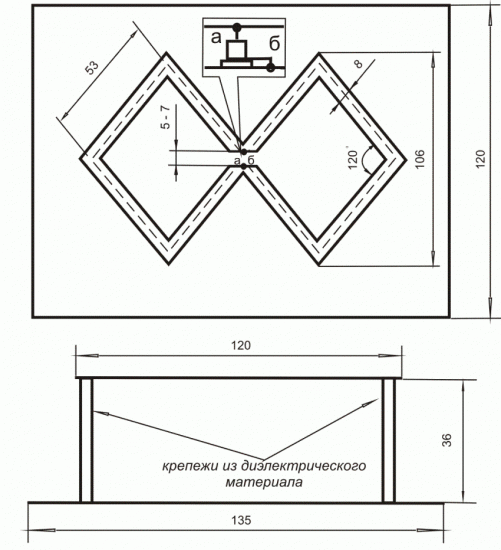 Если дом находится на открытой площадке, антенна-восьмерка, которую разработал Харченко, является оптимальным вариантом. Это два ромба, соединенных и сориентированных по оси, проходящей вдоль диагонали. Сторона равна расчетной полудлины среза волны. Материал – медная жила с сечением 2-3 мм или алюминиевая 5-6 мм. Концы отреза соединяют, ромбы тоже, чтобы конструкция была целостной.