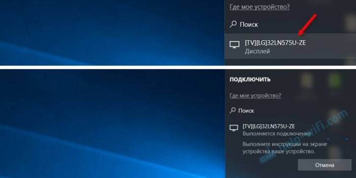 Телевизор должен появится в результатах поиска. Просто выбираем его и пойдет процесс подключения.