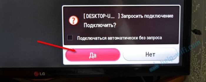 Там будет надпись «Выполните инструкции на экране устройства». В моем случае, на телевизоре нужно подтвердить подключение компьютера.