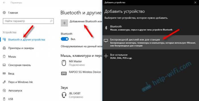 Есть еще один способ. В параметрах перейдите в раздел «Устройства» и выберите пункт «Добавление Bluetooth или другого устройства». Затем нажмите на «Беспроводной дисплей или док-станция».