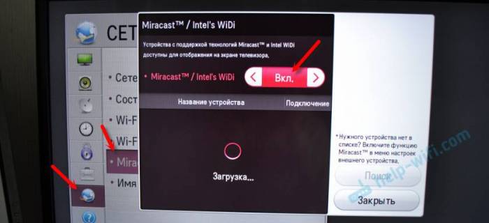 Скорее всего, нужно включить функцию Miracast/Intel WiDi на телевизоре. В старых моделях LG, это делается в меню, в разделе «Сеть». Вот так: