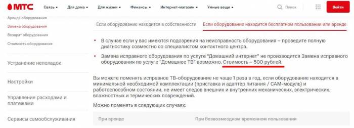 Компания выделяет два вида аренды – обычную и «бесплатное пользование». В обоих вариантах вы сможете заменить девайс, если он соответствует описанным условиям. Однако на сайте компании указано, что обмен исправного ТВ гаджета – платный, и составляет 500 рублей. Подробнее выяснить этот нюанс можно будет у оператора, на момент подачи заявки.