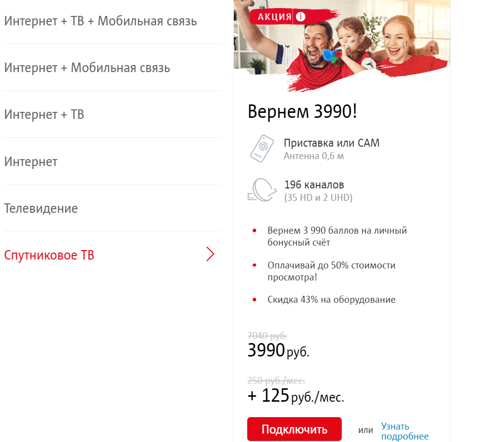 Выгоднее купить комплект по акции со спутниковой тарелкой 0,6 м, CAM или приставкой, смарт картой за 3990 рублей. В рамках акции подписка на пакет «Расширенный» обойдется 125 рублей в месяц. В него входит 196 каналов, из них 35 в HD и 2 UHD. При этом на счет абонента возвращается оплаченная сумма. Ее можно использовать для оплаты подписок.
