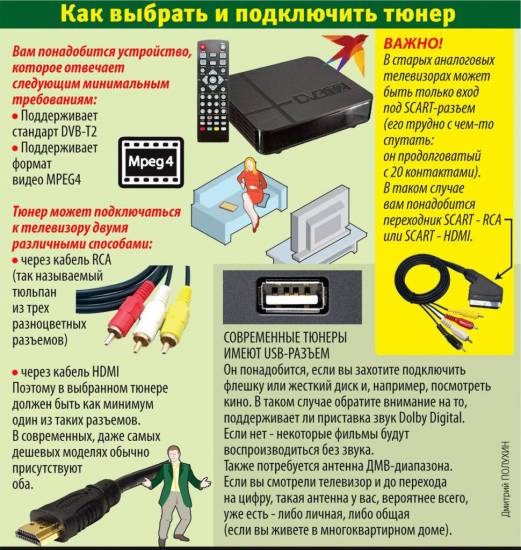 Перед приобретением приставки лучше пролистать обзоры на нашем сайте. В текущий момент на рынке представлено свыше 360 видов таких аппаратов, различающихся набором встроенных функций. Каждая из моделей имеет два разъёма для подключения: RCA («тюльпаны») и HDMI, при этом кабель типа RCA-RCA чаще всего (но не всегда) входит в комплект. Для телевизора с разъёмом SCART придётся купить переходник.