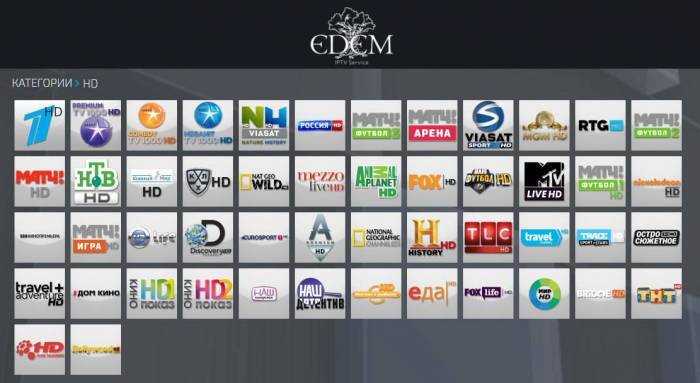Благодаря данной технологии зритель получает возможность смотреть сотни каналов. Сервис Edem TV-IPTV предоставляет доступ к чуть более 100 телеканалам из 15 стран. С полным перечнем каналов можно ознакомиться в соответствующем разделе на сайте «Категории».