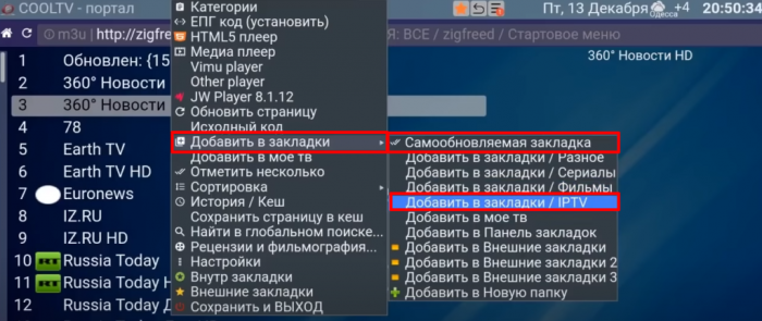 1. Откройте любой плейлист. Наведите курсор на канал и нажмите красную кнопку и выберите Добавить в закладки. Добавьте в самообновляемые и IPTV закладки.
