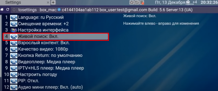 2. Проверьте, чтобы функция живого поиска была включена. Она отвечает за подсказки во время поиска, чтобы можно было набрать 3 буквы, а название фильма уже появилось.