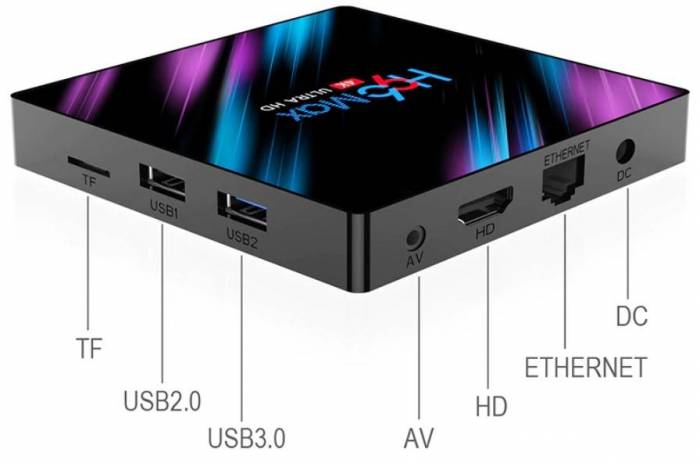В мультимедийной тв приставке реализована поддержка видео в разрешении 4K, вывод изображения на экран выполняется через кабель HDMI. Также устройство укомплектовано оптическим выходом для вывода звука в цифровом качестве, разъемом AV, несколькими портами USB.