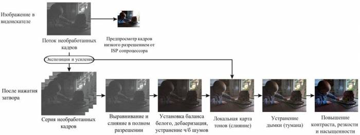 Когда серия снимков будет сделана, она объединяется в один снимок. Тут выручает заниженная выдержка, благодаря которой каждая фотография в серии выглядит относительно четко. Из трех первых кадров выбирается самый приемлемый в плане как резкости, так и детализации для использования в качестве основы. Затем полученные снимки разделяются на фрагменты и система проверяет, можно ли совместить соседние фрагменты и как это сделать. Обнаружив лишние предметы в одном из фрагментов, алгоритм удаляет этот фрагмент и выбирает похожий с другого кадра. Полученные снимки обрабатываются с помощью специального алгоритма, основанного на методе удачных экспозиций (в основном он применяется в астрофотографии для уменьшения размытости изображений, вызванной мерцающей атмосферой Земли).