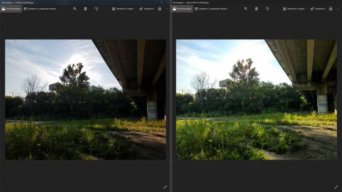 Слева фотография из стоковой камеры Samsung в HDR, а справа фотография, созданная в Gcam в HDR+. Видно, что алгоритм принес в жертву детализацию неба для прорисовки объектов на земле.