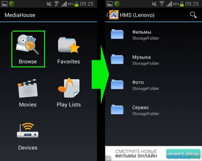 Я же сам использую программу MediaHouse — взять ее также можно из Play Маркета. Настройка DLNA здесь вообще не требуется. Запускаете программу-сервер на компьютере, и он сразу отобразится в списке доступных подключений.