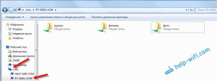 В случае с роутером ASUS, на вкладке сеть, у меня сразу появилось сетевое устройство, открыв которое, мы получаем доступ к флешке. Возможно, понадобится указать имя пользователя и пароль. Это те же данные, которые вы указываете при входе в настройки роутера.