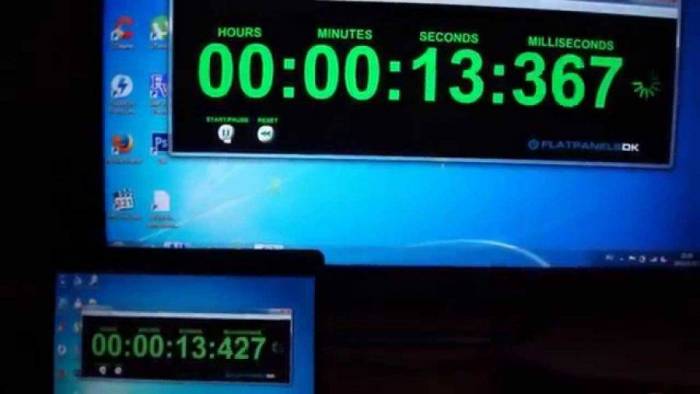 Значение инпут лага можно измерить при помощи ноутбука, подключенного к телевизору через провод- HDMI в режиме дублирования изображения. После запуска секундомера на ноутбуке делают не менее десяти-пятнадцати общих фото, просмотр которых покажет некоторое отличие цифр секундомера на мониторе ноутбука и экране телевизора. Величина инпут лага – это разность между показателями секундомеров, то есть, их среднее значение.