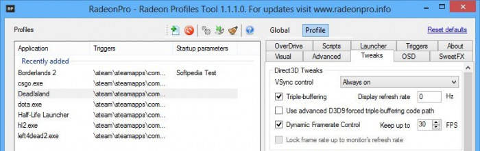 Укажите * .EXE-файл с игрой, чью графику вы хотите отредактировать. Затем выберите игру в списке в RadeonPRO и перейдите на вкладку «Tweaks» справа. Проверьте флажок «Динамическое управление рамкой» и введите «58» или меньшее значение в поле «Держать до», которое, как вы знаете, вы всегда получите (например, 45 FPS).