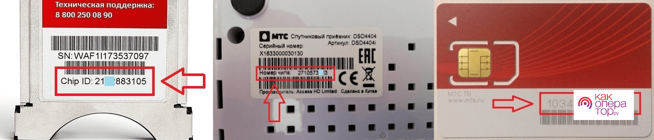 Для активации спутникового телевидения пользователю необходимо знать также номер SIM-карты и ID-устройства, обрабатывающего сигнал. Найти первое значение можно на пластиковой карточке, там, где обычно пишется номер телефона. Chip ID устройства находится на специальной наклейке на ТВ-приставке или модуле. Понять, что это именно то значение легко, ведь оно подписано.