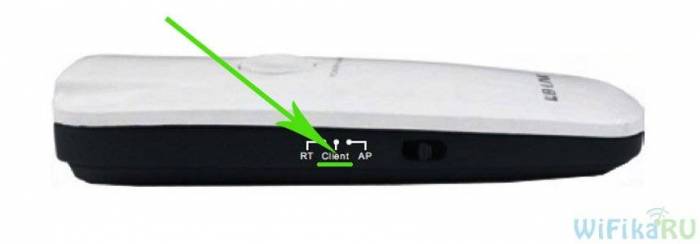 - Сначала подключим роутер патчкордом к компьютеру, зайдем в админку и активируем режим клиента. Напомню, чтобы попасть в панель настроек, нужно, чтобы IP компьютера был из той же подсети, что и роутера (узнать его можно из инструкции или наклейки на корпусе)