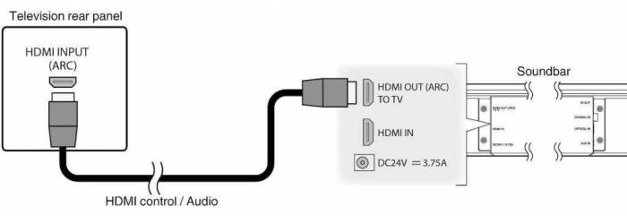 В случае отсутствия аудио/видео приемника можно использовать звуковую панель, включающую в себя второй интерфейс HDMI. Это обеспечивает прямое подключение к устройству для сохранения качества звучания. При подключении панели к ТВ через ARC будет такой же эффект взаимообмена аудио и видео информации по одному каналу.