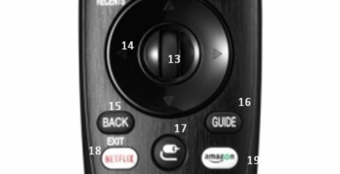 Далее идет основной и самый интересный блок. Под цифрой 13 обозначено колесико прокрутки для удобного перелистывания веб-страниц. Его опоясывают привычные кнопки управления. Под цифрой 15 скрывается действие «Назад», а под 16 – открытие телепрограммы. Кнопка с кабелем нужна для отображения подключенных устройств. А по бокам расположена пара клавиш для быстрого вызова онлайн-кинотеатра.