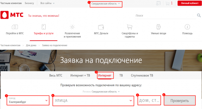 На следующем шаге вверху из списка выберите регион проживания, а затем ниже перейдите в раздел “Интернет”. Несмотря на то что МТС предоставляет услуги по всей территории РФ, необходимо предварительно проверить техническую возможность подключения. Поэтому выберите город проживания и укажите полный адрес.