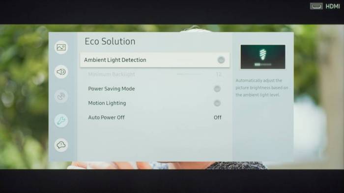 One of the first things we did was disable all of the Eco Solution options, as we don’t want the TV to adjust the image during testing.
