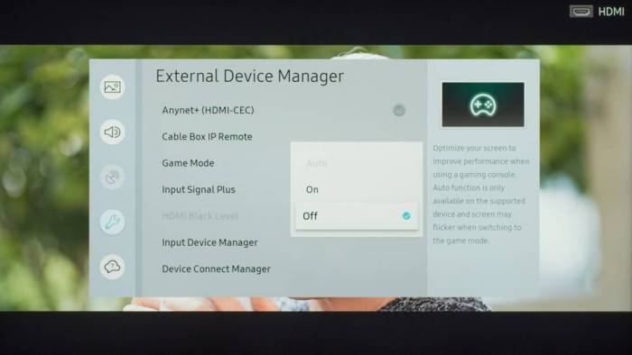 From the base SDR and HDR settings, very few changes are required for a great gaming experience. When you start gaming, it is best to enable Game Mode from the External Device Manager tab in order to get the lowest input lag, and use the recommended settings for SDR or HDR. For HDR gaming, it is important to make sure that Input Signal Plus is enabled for the input you are using. You can leave Game mode to ‘Auto’ and the TV will detect when it is connected to a compatible device like Xbox.
