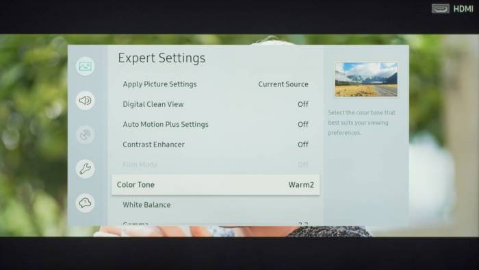 As we aim for an image that is as close as possible to the content creator’s intent, we disable most image processing options, including Digital Clean View, Auto Motion Plus, and Contrast Enhancer. You should adjust these to your personal preference, though.