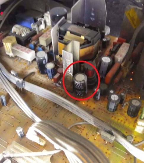 После снятия задней крышки, сразу в глаза бросился вздувшийся конденсатор. Номинал данного конденсатора составляет 100 мкф на 160 вольт.