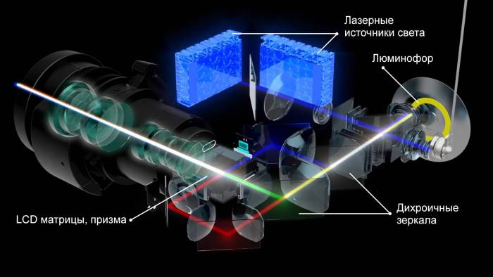 В традиционном варианте реализации 3LCD свет от источника (как классической лампы, так и лазерного источника света, используемого в самых новых моделях компании) падает на зеркала, установленные в оптическом блоке проектора. Эти зеркала или «фильтры» пропускают свет только одного из цветов (свет в определенном спектре) и отражают оставшуюся часть света. Проходя через систему из двух таких зеркал, весь поток белого света разделяется на три основных его составляющих – красный, зеленый и синий (R, G, B). Затем каждый из цветов попадает на соответствующую ему ЖК-матрицу.