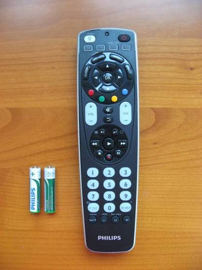 - Установка батареек. Часто ПДУ продаются без источников питания, хотя они могут идти в комплекте. При желании больше никогда не покупать батарейки, рекомендуем сразу выбрать аккумулятор. Ему потребуется лишь периодическая подзарядка, но и стоит устройство дороже.