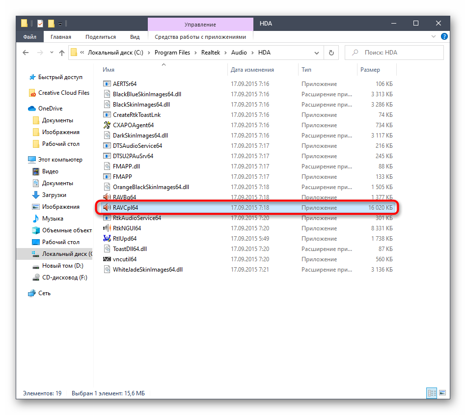 Здесь запустите исполняемый файл «RAVCpl64» для открытия графическое меню. Если после нескольких секунд ожидания меню так и не отобразилось, попробуйте нажать на «RAVBq64» или «RtkNGUI64».