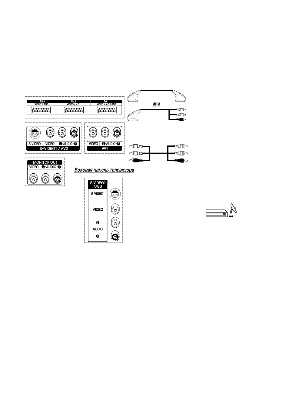 AV3)”, а видеомагнитофон к -“MONITOR OUT”, чтобы перенаправить сигнал с “Ext.1 (Ext.2, Ext.3, AV1, AV2 или AV3)” на “MONITOR OUT”.