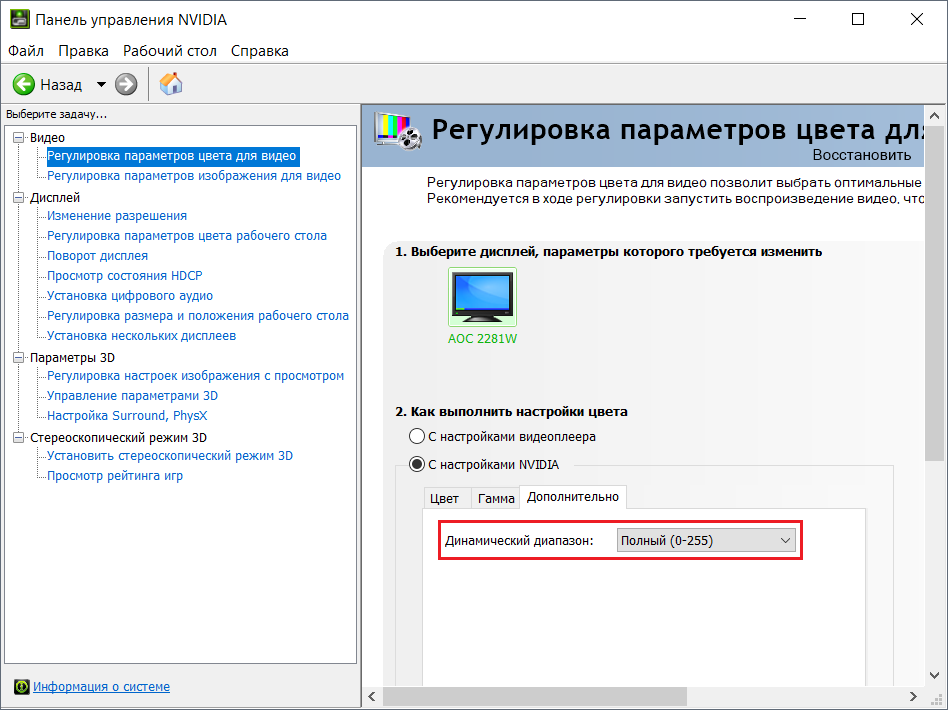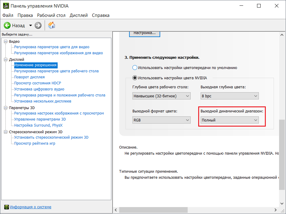 В результате динамический диапазон изображения сужается, цвета становятся блеклыми, черный цвет выглядит темно-серым (т.к. монитор полагает, что 16, 16, 16 – это темно-серый), белый также лишен интенсивности (т.к. 235, 235, 235 — это уже не белый), с прочими цветами то же самое. То есть картинка достаточно сильно страдает, и особенно хорошо это заметно с IPS-мониторами. Однако исправить это нетрудно: нужно зайти в Панель управления, найти там Панель управления Nvidia, зайти в графу «Изменение разрешения» и выставить «Полный выходной динамический диапазон», после чего применить изменения: