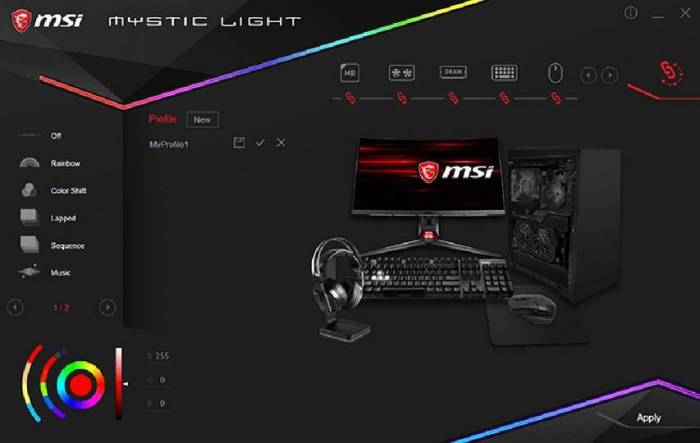 Именно такой контроль дает вам в руки приложение MSI Mystic Light. С его помощью регулируется вся подсветка, от материнской платы до светодиодных лент, при этом интуитивно понятный интерфейс позволяет без малейших усилий настроить даже очень сложные визуальные эффекты.