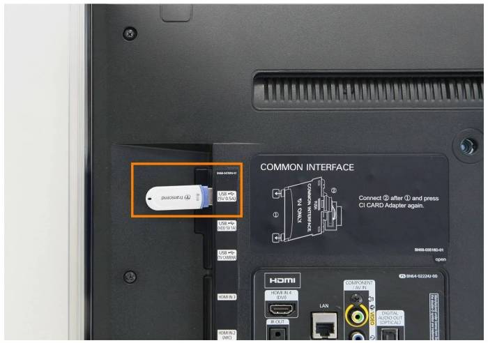 - Включить ТВ-устройство и вставить флешку в USB-разъём.