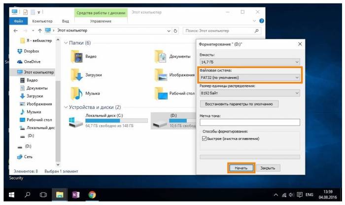Позаботьтесь о том, чтобы у вас на руках была флешка, причём отформатированная заранее в формате FAT. Для этого вставьте её в ПК, зайдите в «Мой компьютер», кликните по иконке флешки правой кнопкой мыши, нажмите «Форматировать». В новом окне проверьте, чтобы формат совпадал с указанным выше. При полной готовности, а также при соответствии параметров нажмите «Начать» и дождитесь окончания операции.