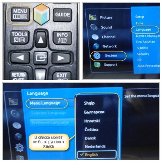 Часто предварительно требуется изменить язык интерфейса. Для этого находят на пульте кнопку «Menu», а в самом меню на экране — кнопку «System». Из выпадающего меню выбирают функцию «Language» и «Menu Language». Все шаги показаны в коллаже ниже.