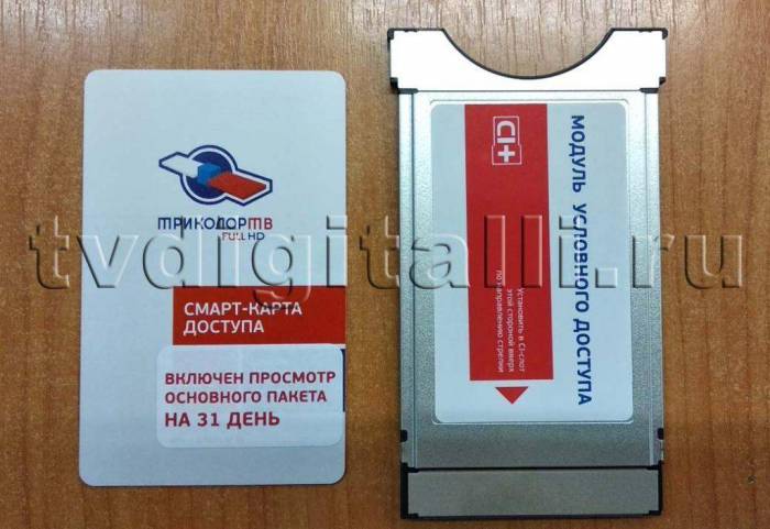 Обычно карта доступа идет в комплекте с ресивером, соединяющимся с телевизором проводами. Но с недавнего времени можно купить карту Триколор ТВ и без оборудования. Так называемый, встраиваемый САМ модуль (CI и CI+) Ultra и Full HD высокой и сверхвысокой четкости идет в комплекте с носителем. Он избавляет владельцев современных ЖК телевизоров с цифровыми стандартами от необходимости иметь внешнее устройство, отдельный пульт и дополнительные провода для соединения.