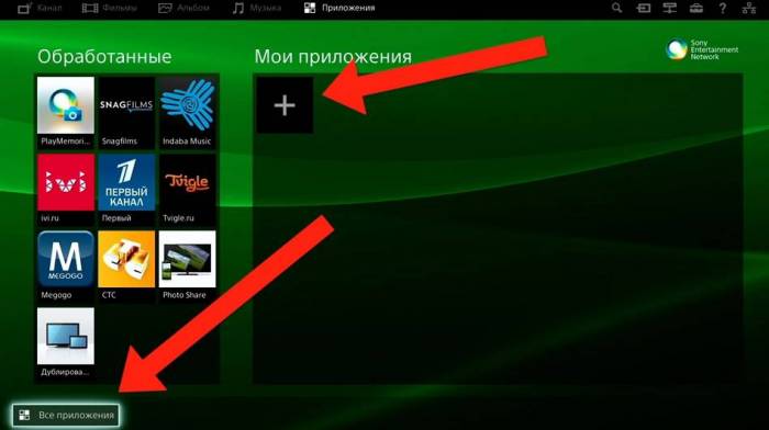 После этого произойдет поиск доступного контента и его загрузка. Она производится через сервер интерактивных служб Сони Интертеймент Нетворк. Загружается после проверки подлинности адресов устройства и сервера. По окончании загрузки содержимого появится просьба посетить Главное меню с нажатием клавиши «HOME». Но жать нужно кнопку «SEN». Это сразу переведет нас к списку контента — зарубежных и русских приложений, каналам с интернет-видео.