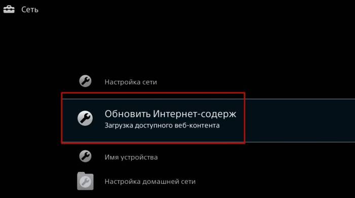 Установка умной операционной системы Sony Smart TV Bravia существенно расширяет возможности телевидения. После нажатия кнопки «HOME» на пульте телеприемника жмем «Установочное меню». Затем — в подменю «Сеть», «Обновить Интернет-содержимое».