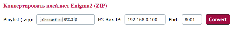 To convert your E2 playlist, the contents of /etc/enigma2/ directory of your E2 STB box will need to be put to Zip archive together with stream IP address and port number input in the form. You should then recheck the EPG codes according to the channel names or assign them manually.