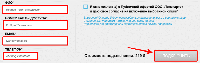 Заполните бланк заказа и нажмите “Подключить”.