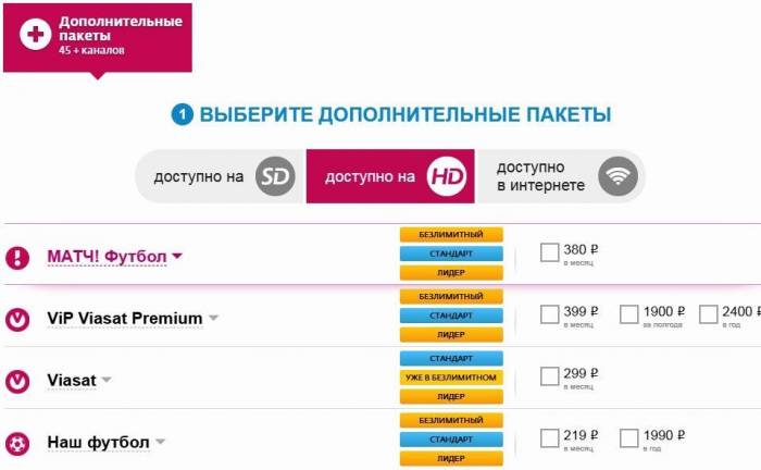 К дополнительным пакетам можно приобрести пакеты каналов с качеством SD, HD и доступными в интернет.