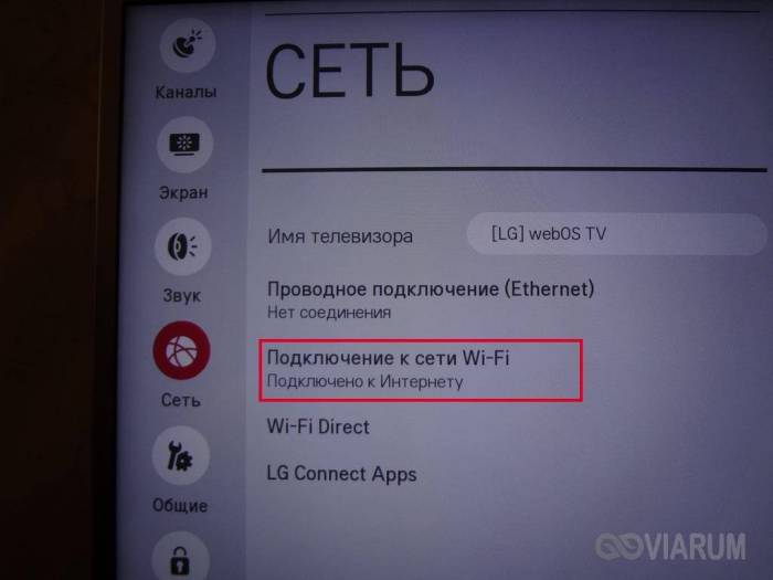 Перед тем, как перейти непосредственно к конфигурированию беспроводного соединения ноутбука с телевизором, необходимо удостовериться, что оба устройства подключены к одной Wi-Fi сети (одному роутеру). У LG для проверки подключения следует зайти через меню настроек в раздел «Сеть».