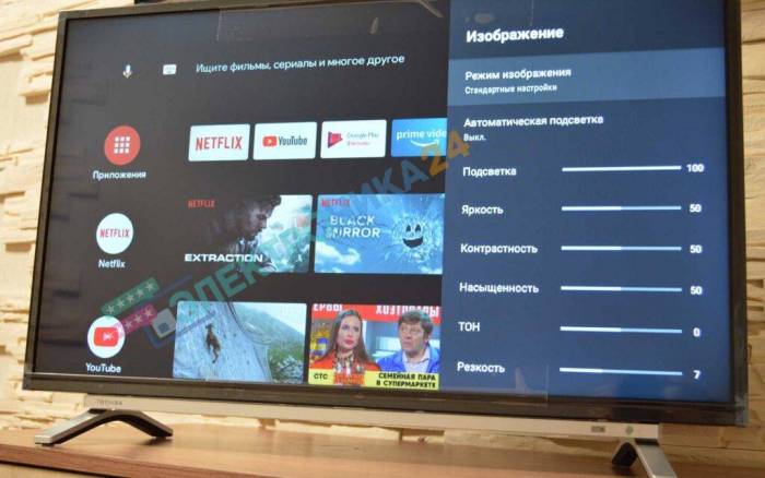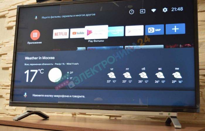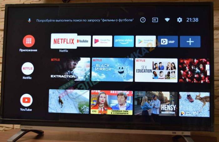 После несложной первичной настройки перед нами открывается рабочий стол с ярлыками программ и роликами с Youtube и Netflix. Интерфейс Smart TV не загроможден какой либо оболочкой, чистый Android TV, такой же как на телевизоре от компании Xiaomi — простой и легко настраиваемый.