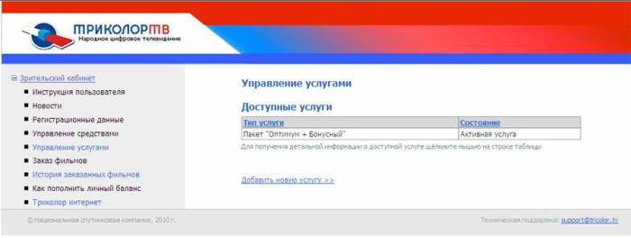 В кабинете можно ознакомиться с инструкцией и новостями, а также подключить любой пакет Триколор ТВ, пополнить баланс или заказать просмотр понравившегося фильма. Интерфейс простой и понятный, информация может быть предоставлена за любой необходимый период с момента заключения договора.